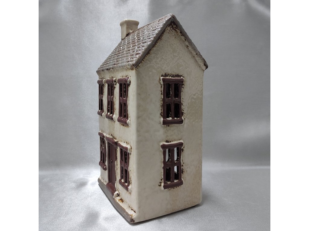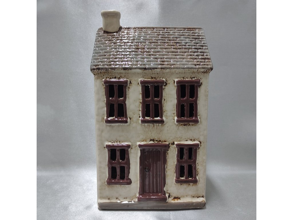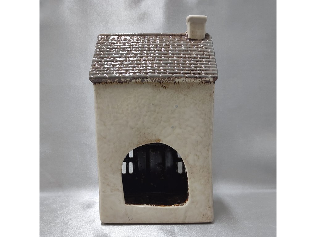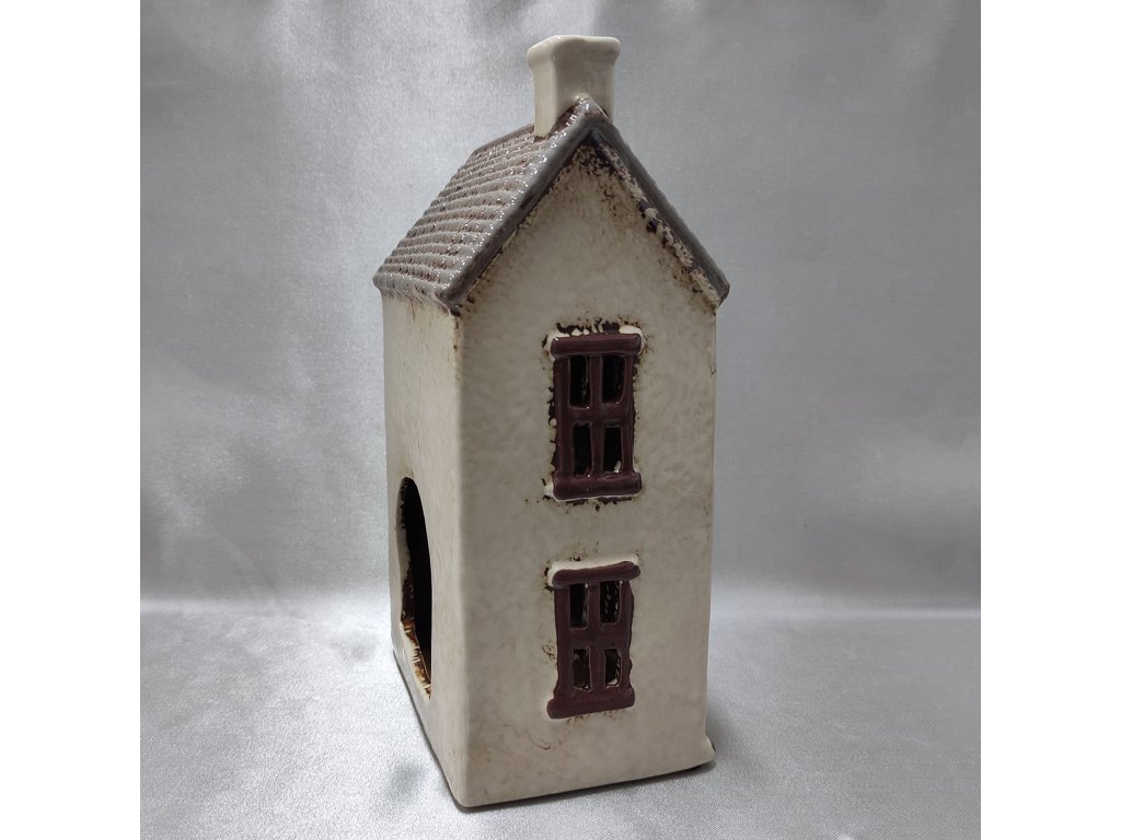 Keramický svícen v podobě vysokého jednopatrového domku s béžovou fasádou, pěti okny a dveřmi v hnědé barvě a komínem vlevo na střeše, je krásnou funkční dekorací pro radost i útulný domov.