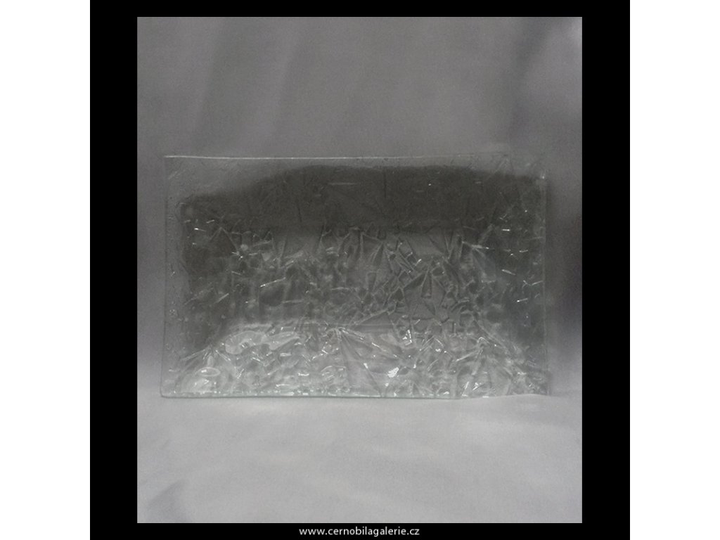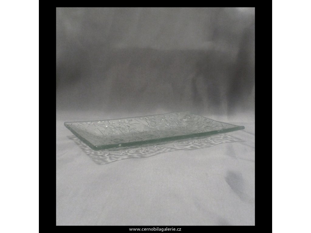 Velká skleněná obdélníková podložka pod svíčky, lze využít také jako dekorační misku nebo talířek, užitná vrchní část z hladkého skla, spodní část s reliéfem - geometrický vzor.