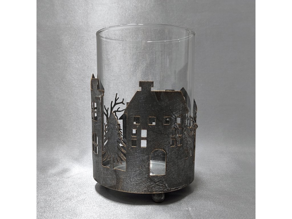 Jednoduchý skleněný válcový svícen s kovovým stojánkem v podobě městečka.