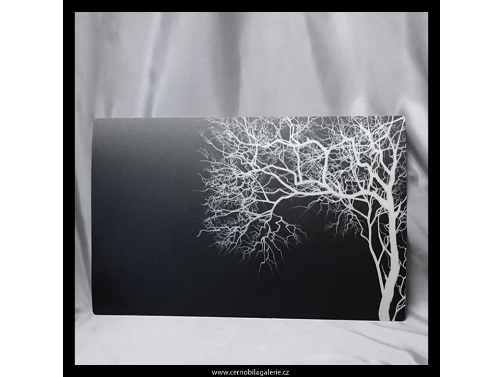 Velké plastové prostírání s motivem bílého stromu na černém podkladu.