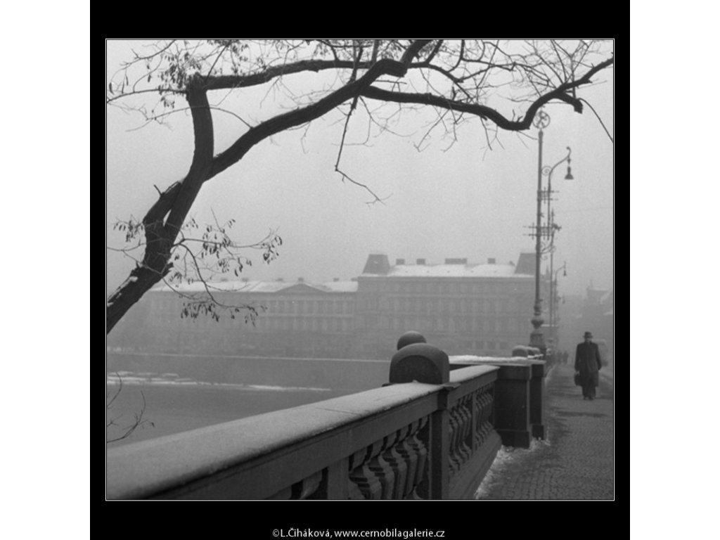 Na první kuk a pro hledání podobných: most Legií (most 1.máje), osamělý chodec, větev, zábradlí, sníh, Vltava, nábřeží