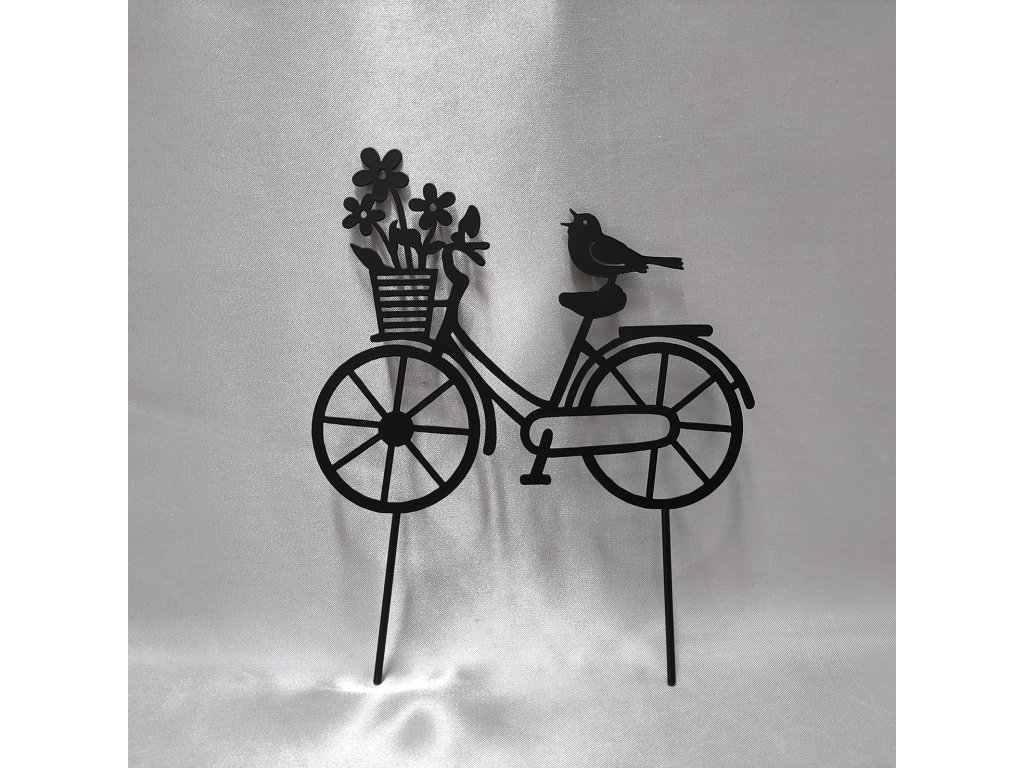 Elegantní černý kovový zápich ve tvaru kola s košíkem květin a zpívajícím ptáčkem.