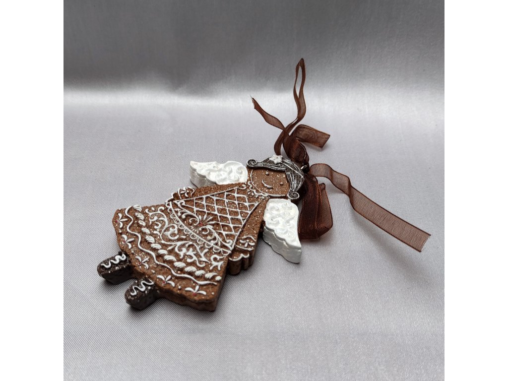 Vánoční ozdoba z polyresinu ve tvaru zdobeného perníčkového anděla, realisticky imituje tradiční cukroví.