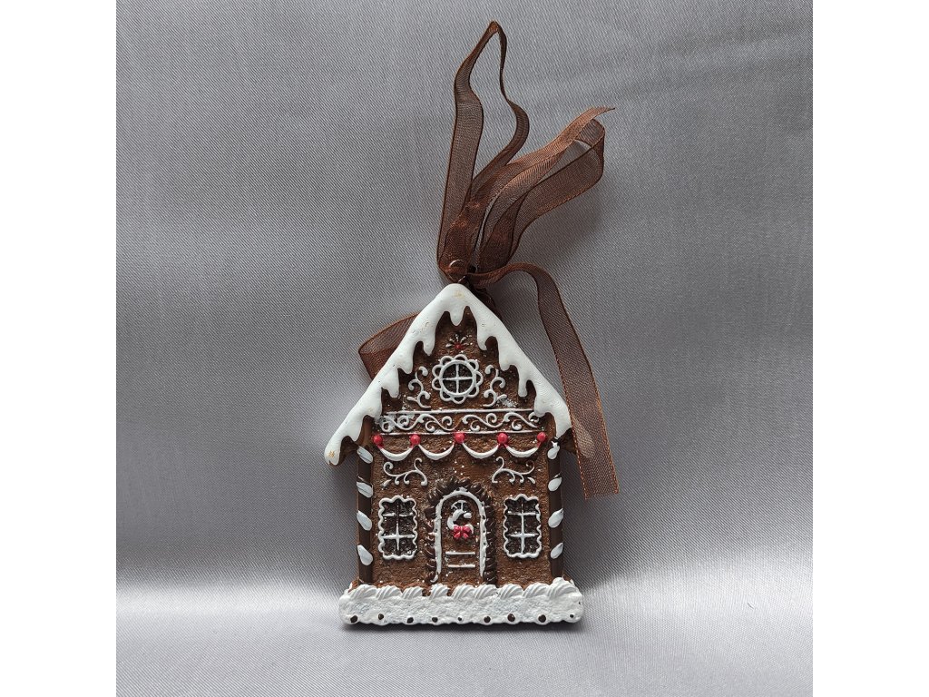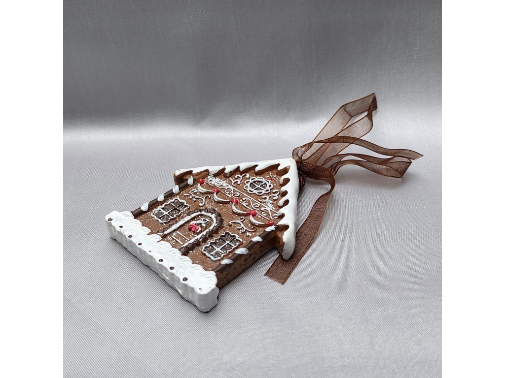 Vánoční ozdoba z polyresinu ve tvaru zdobeného perníčkového domečku, která realisticky imituje tradiční cukroví.